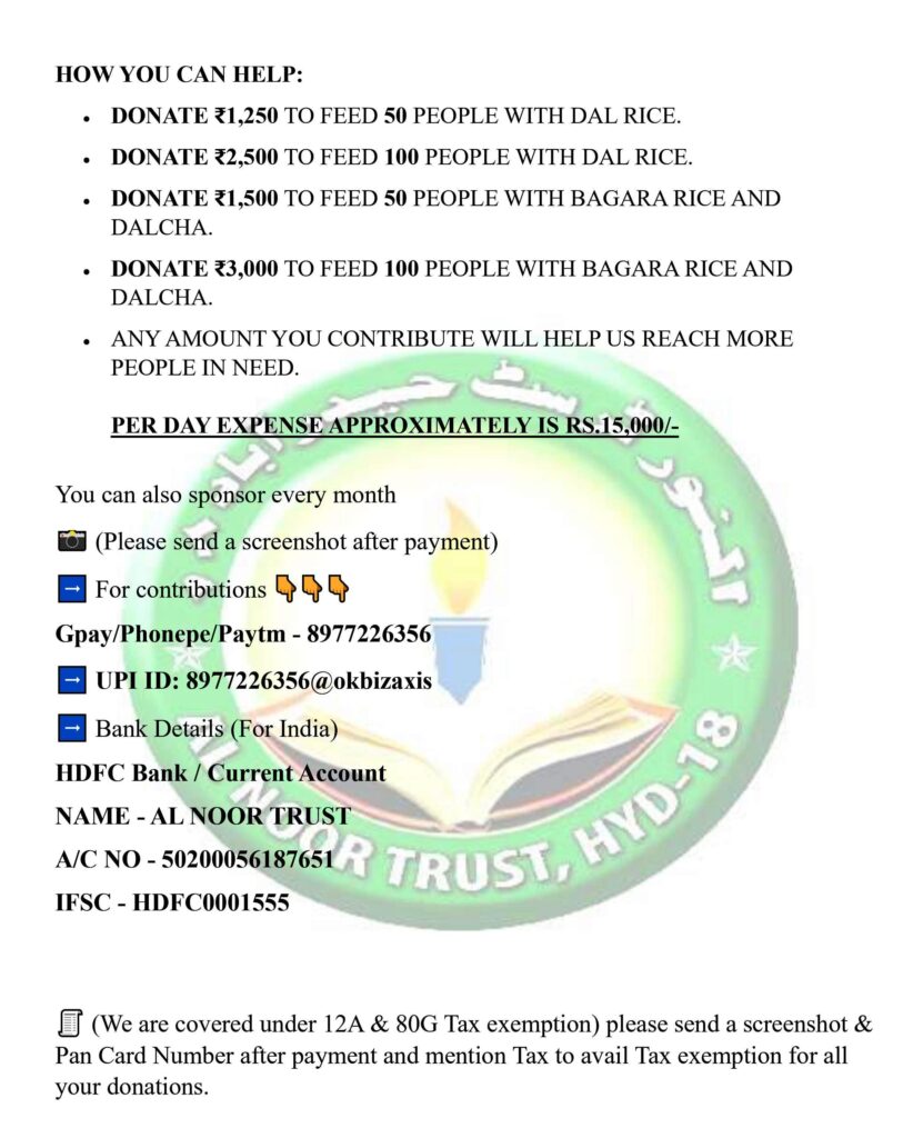 During the pandemic, Al-Noor Trust is helping daily wagers survive this crisis by giving them free meals. Currently, they are giving free meals to over 1000 people outside three hospitals and those in need in Hyderabad every day. These daily wagers belong to the areas in and around Erragadda, Sanath Nagar, Balanagar, Jeedimetla, and other industrial areas which have a large number of labourers who have lost their jobs and have no income to buy food or take care of their families.